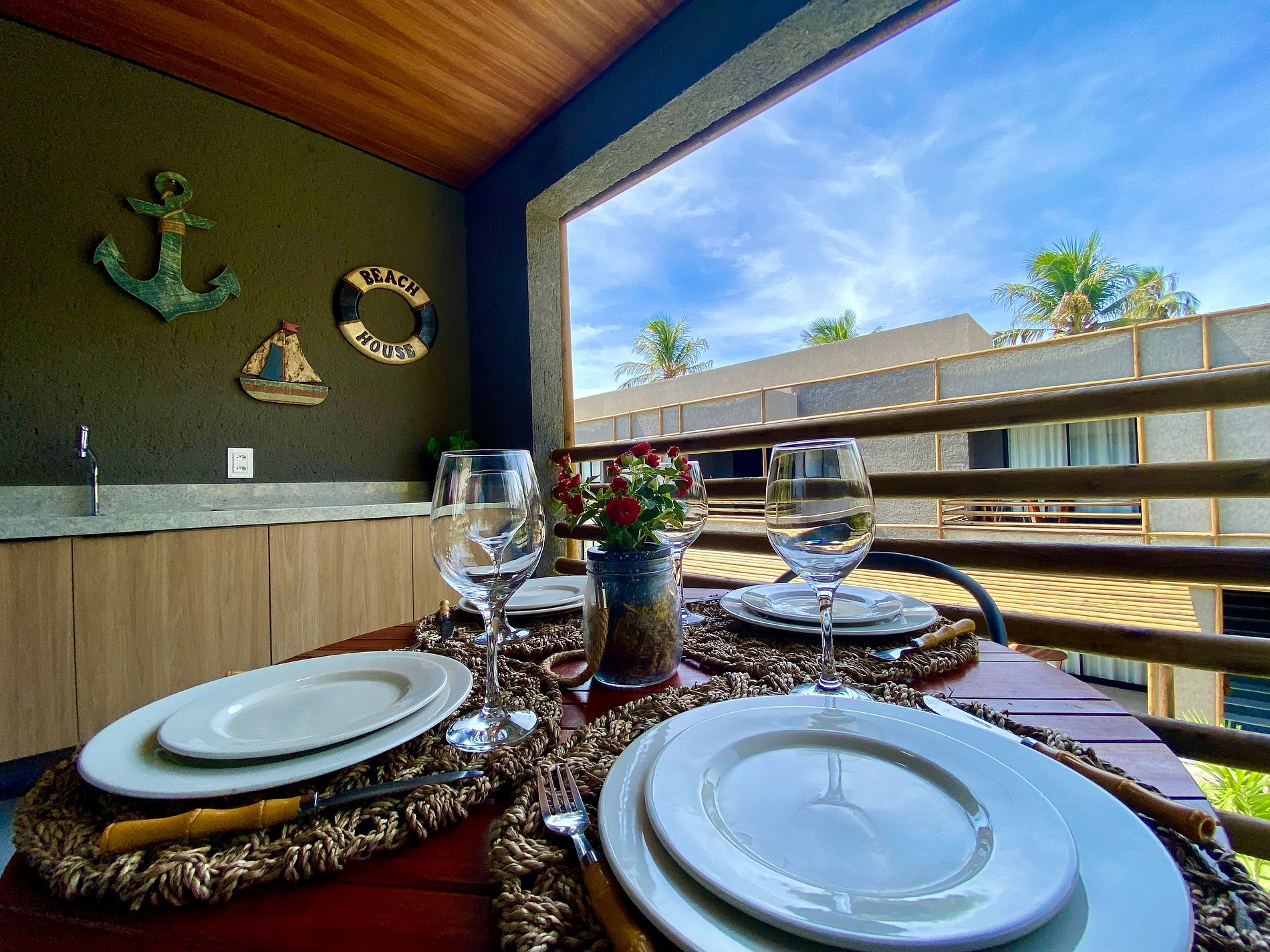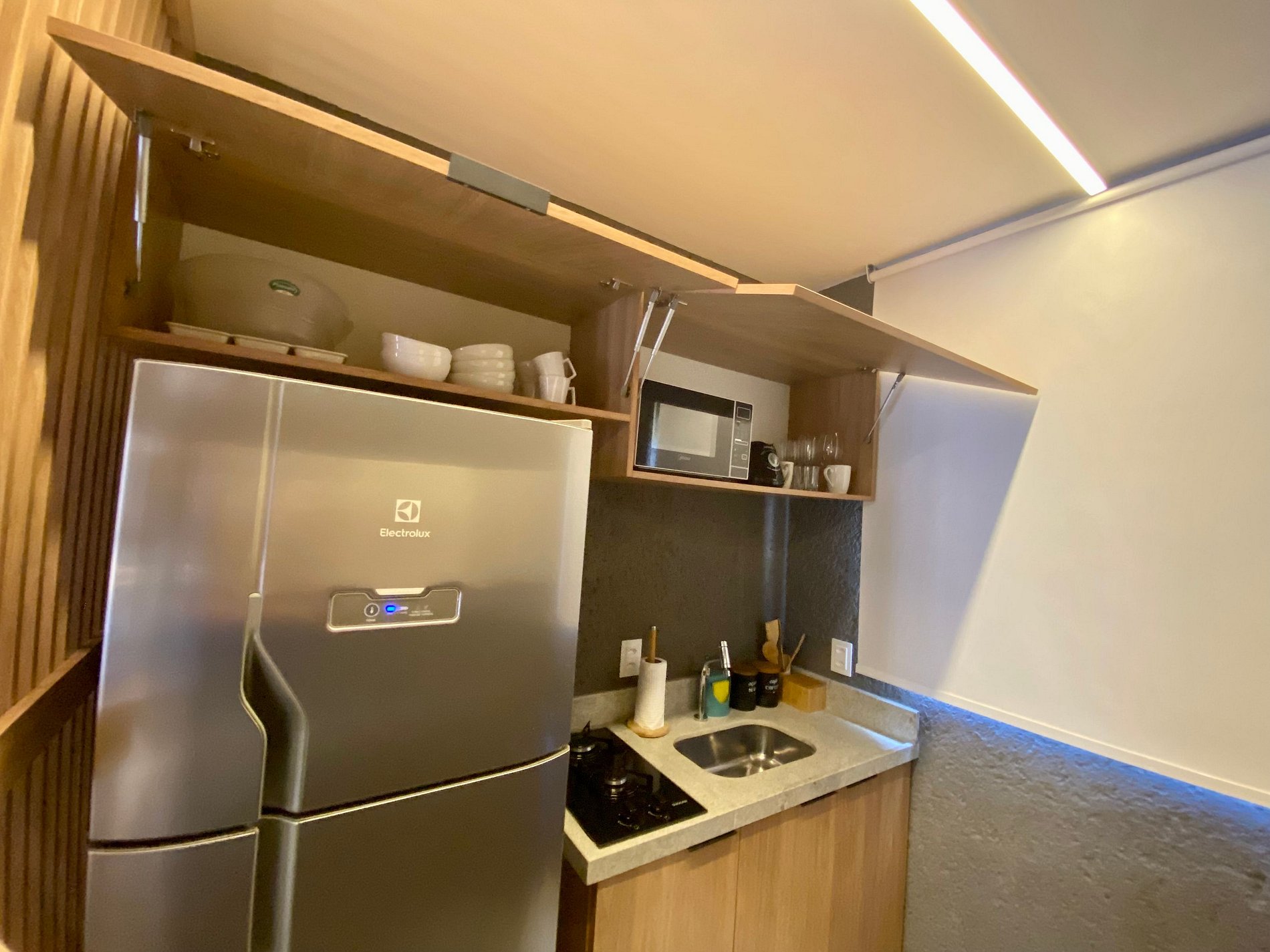 O Studio possui 37m2, com sala de estar com varanda gourmet, cozinha e 01 vaga de estacionamento.