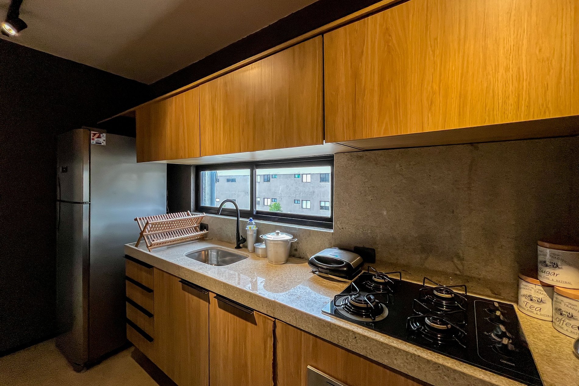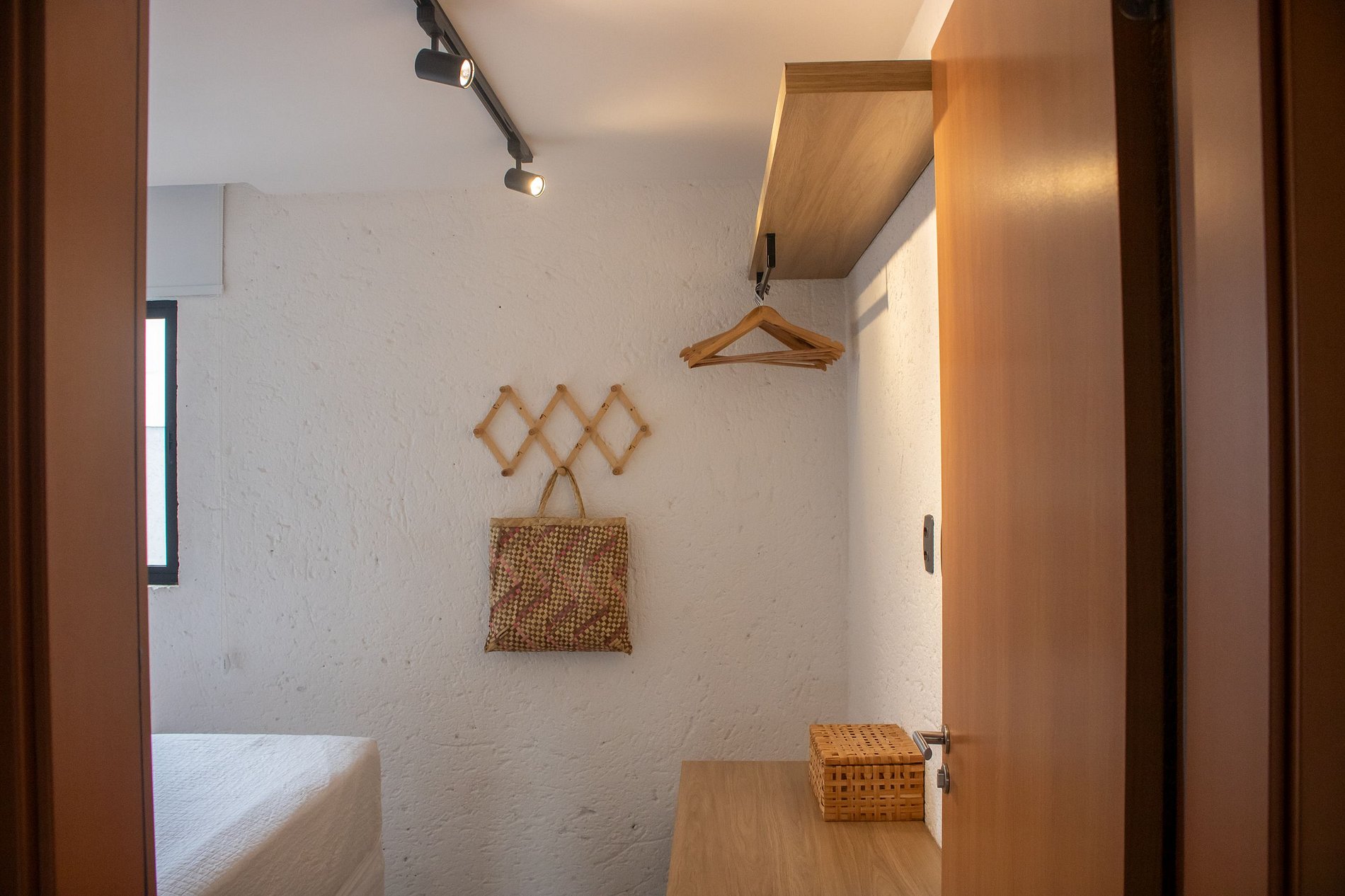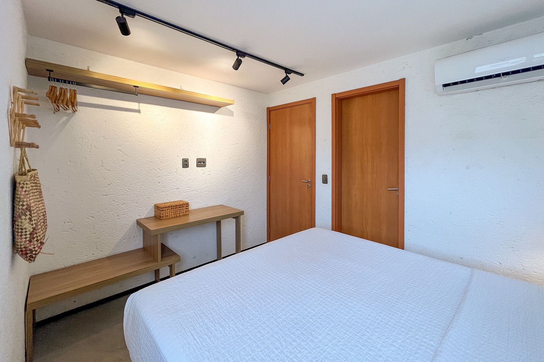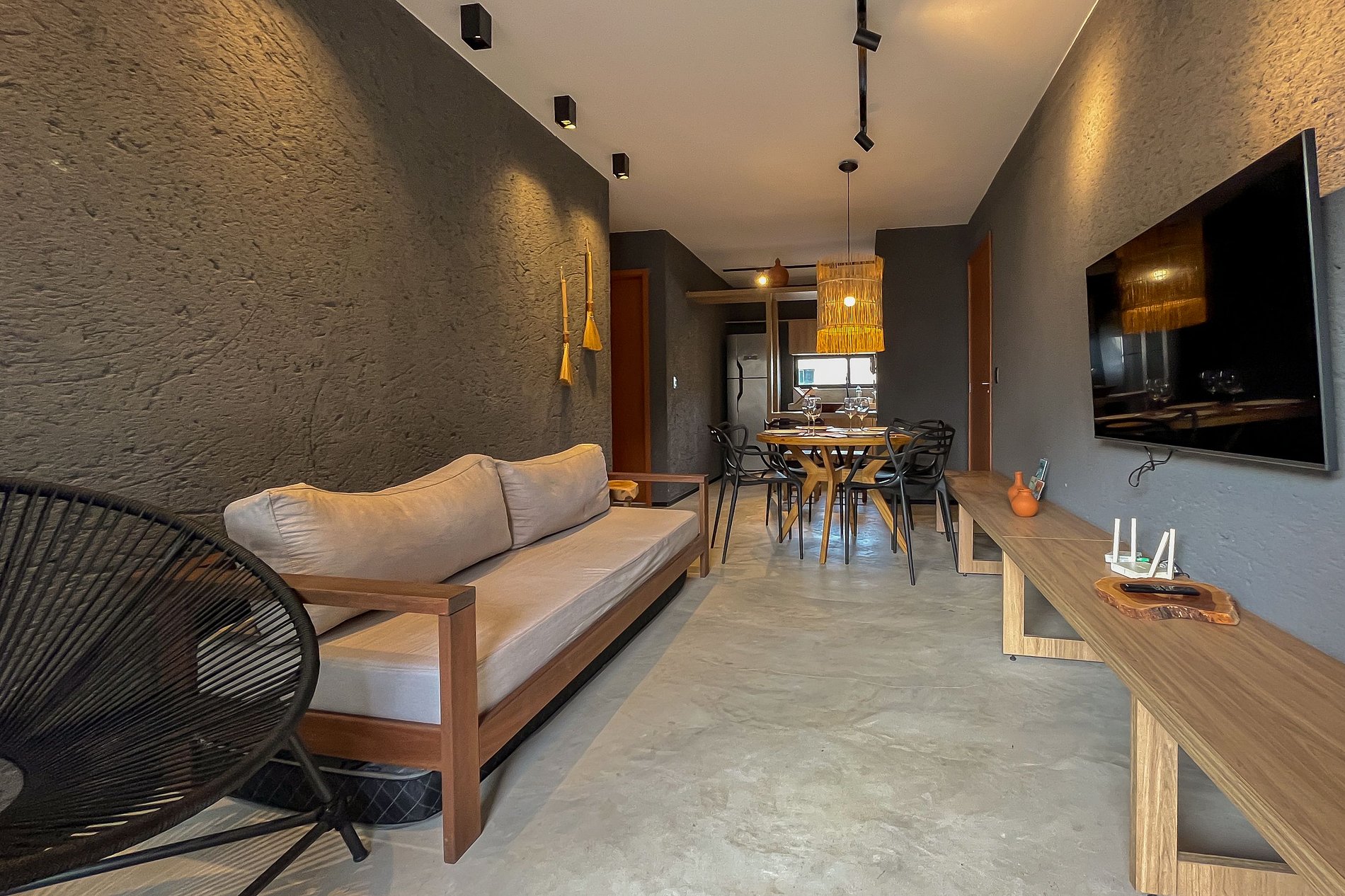 Os tons neutros e madeira natural criam um ambiente acolhedor. A cozinha é completa, a sala convidativa, duas suítes com quartos minimalistas e o banheiro elegante. Tudo impecavelmente limpo e organizado, com detalhes que transmitem conforto e praticidade. É o cenário perfeito para uma estadia serena e memorável. Pura harmonia convidativa!