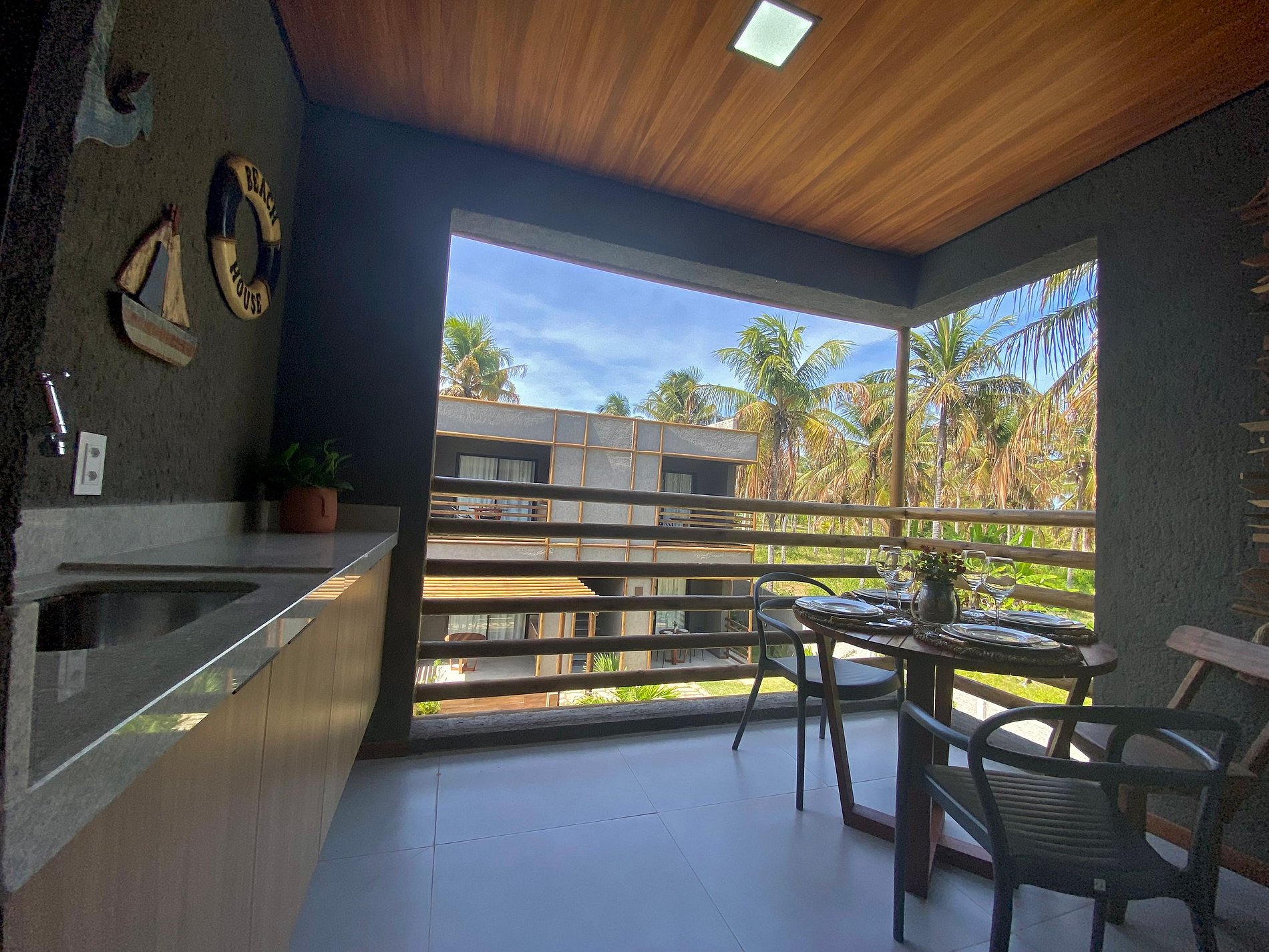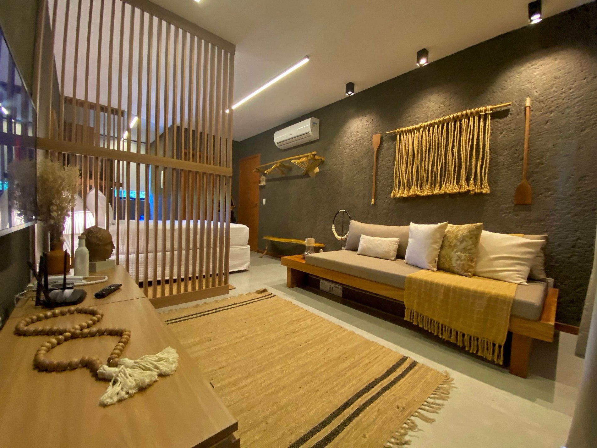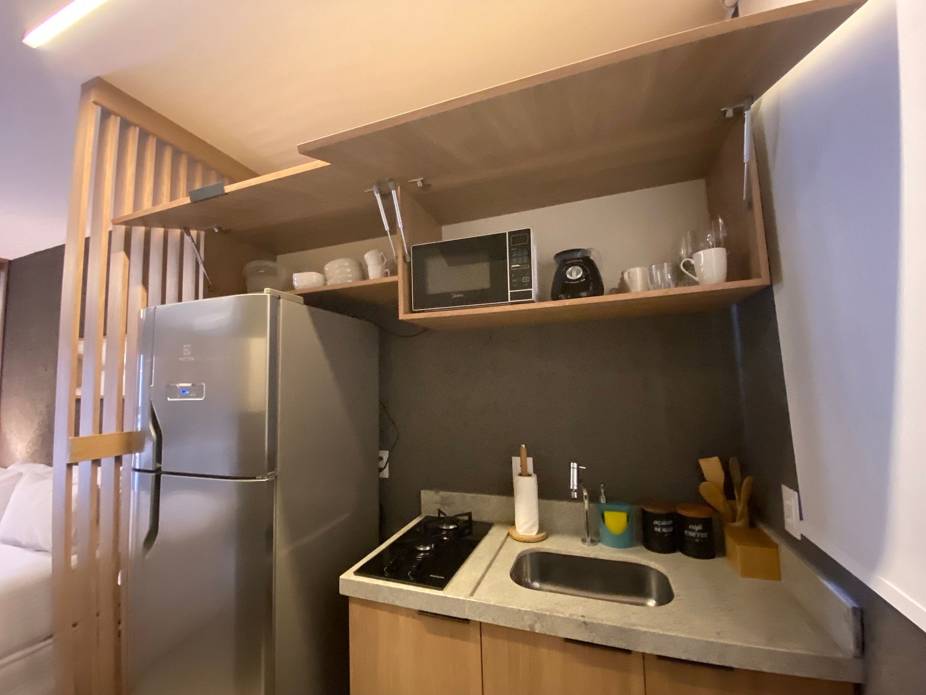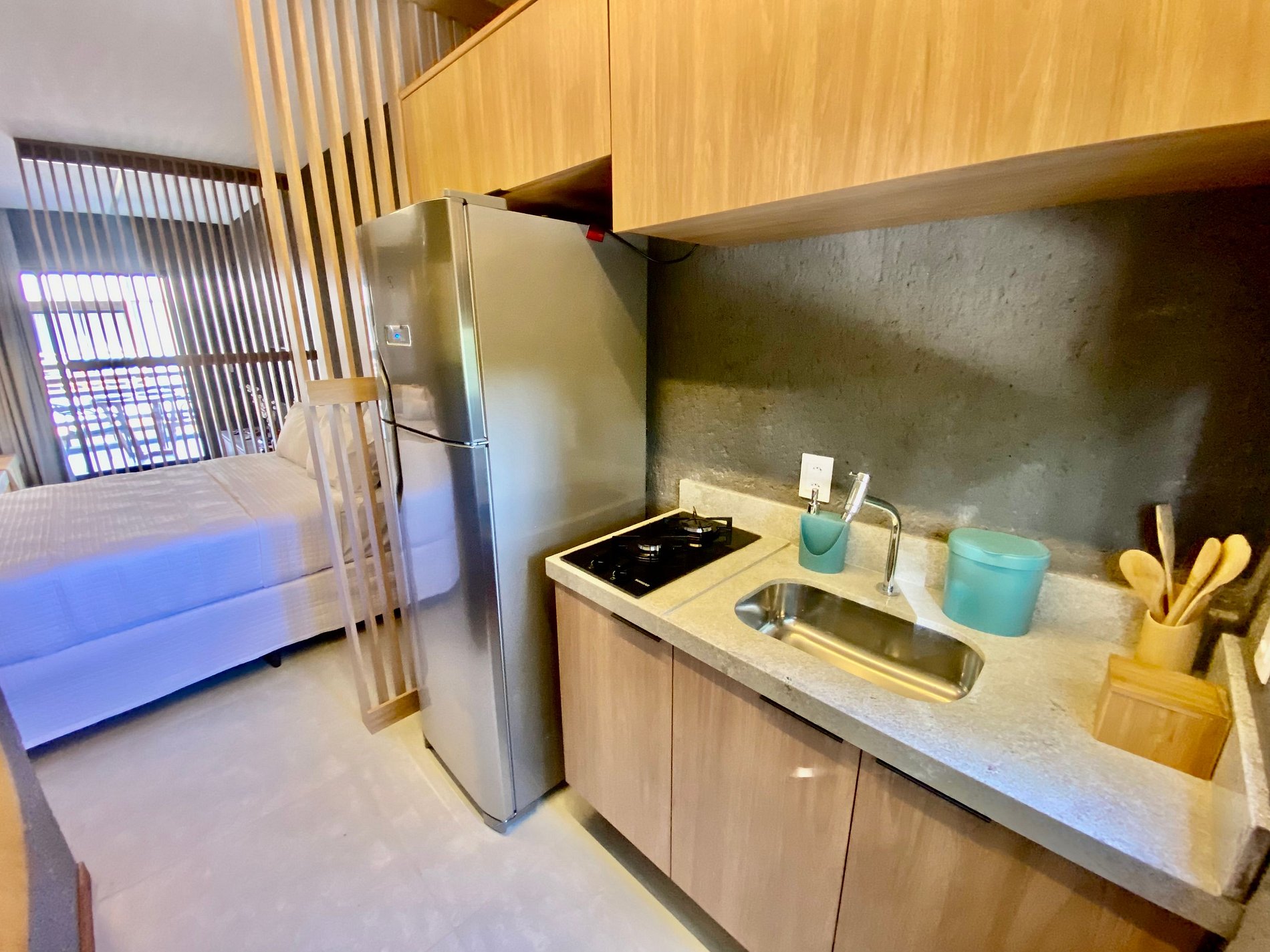 O Studio possui 37m2, com sala de estar com varanda gourmet, cozinha e 01 vaga de estacionamento.