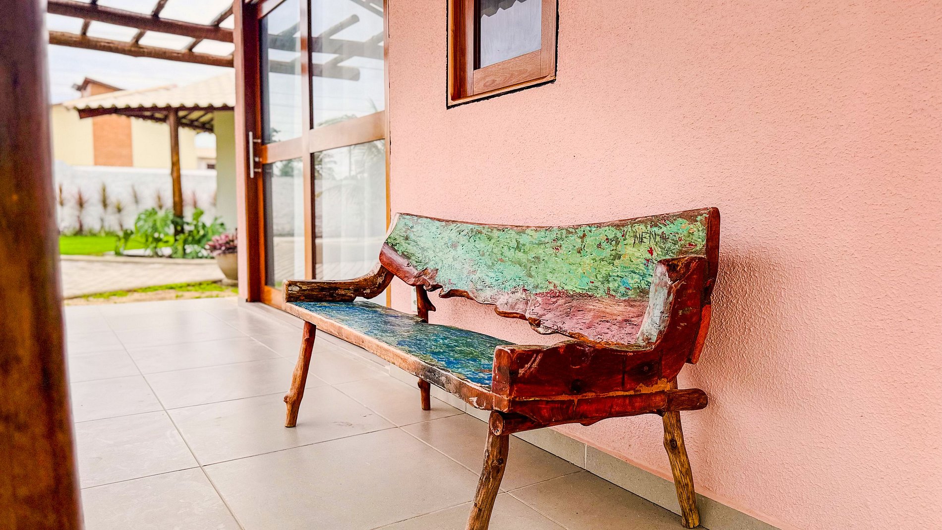 A presença de um pequeno jardim com gramado e o convidativo banco de madeira na varanda não são apenas um deleite estético, mas uma extensão do espaço de vivência, promovendo relaxamento e contato com o ambiente externo.