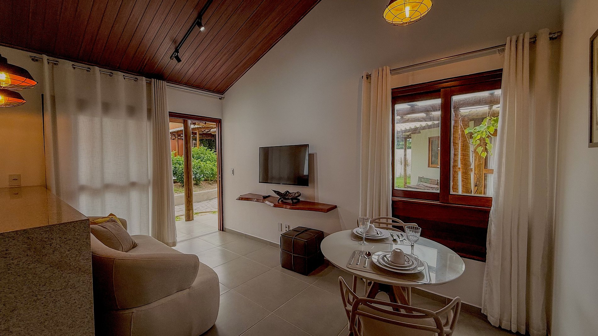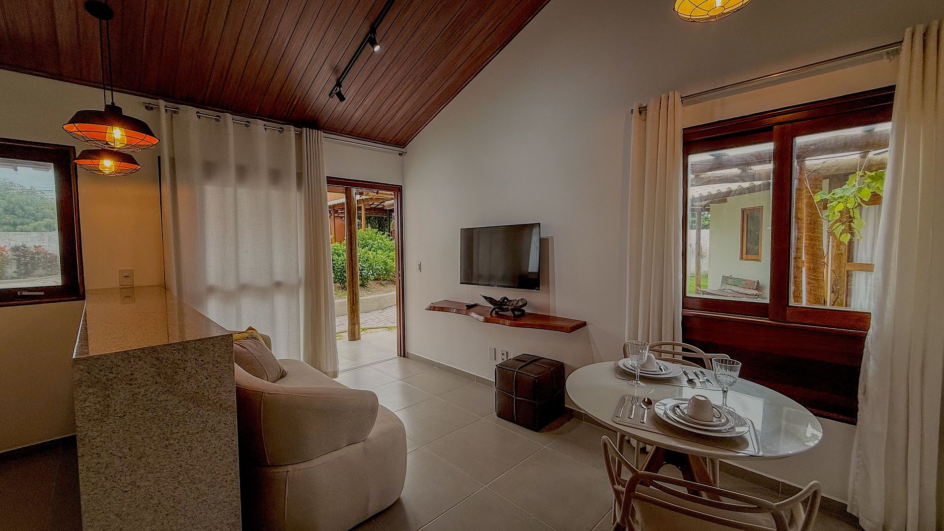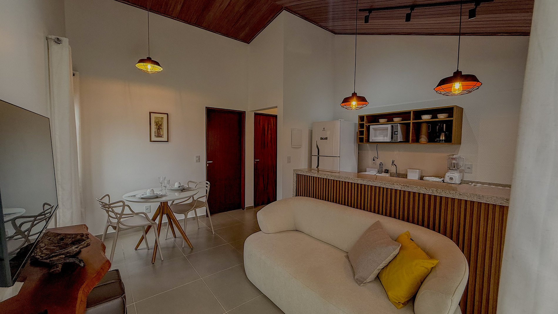 A área de estar com o sofá e a mesa de jantar, mesmo que dimensionadas para o espaço, são funcionais e convidativas, ideais para socialização, refeições ou simplesmente para relaxar após um dia explorando a região.