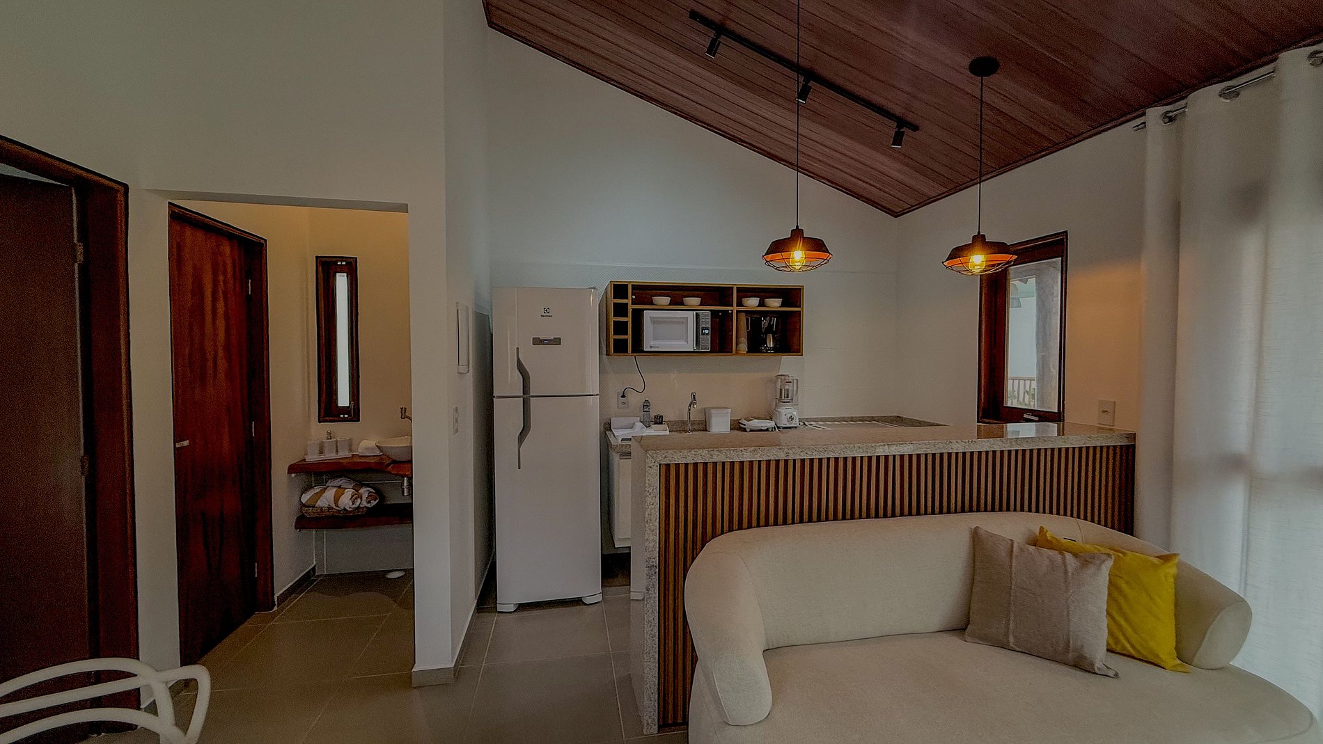 Há uma fusão bem-sucedida entre o rústico dos materiais naturais (madeira, bancadas em pedra) e o moderno dos acabamentos e do layout. O conceito de “espaço aberto” na área social, com o pé-direito elevado e o forro amadeirado inclinado, não só amplia visualmente o espaço, mas cria uma atmosfera acolhedora e arejada. A iluminação estratégica complementa o design, valorizando cada ambiente.