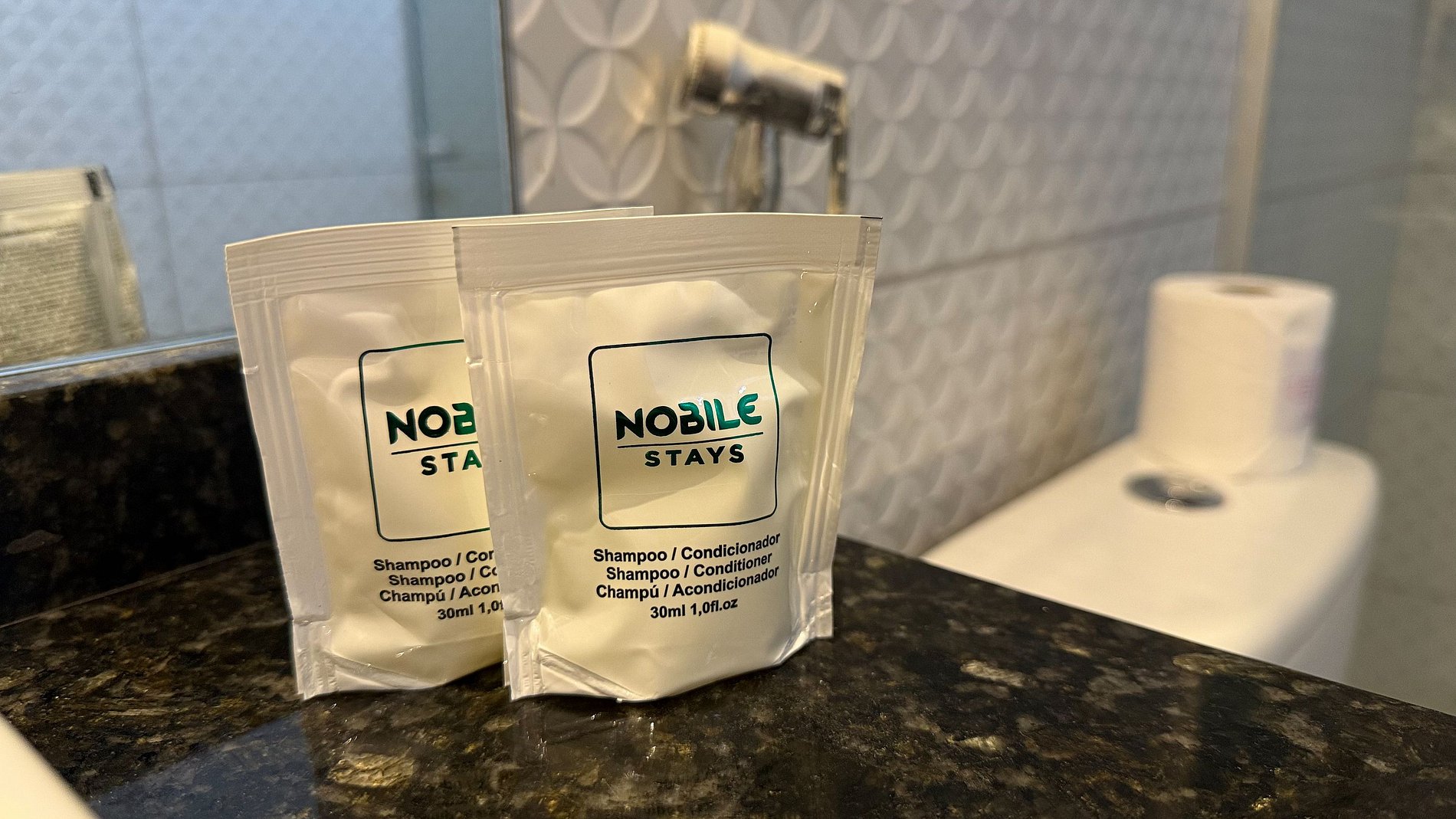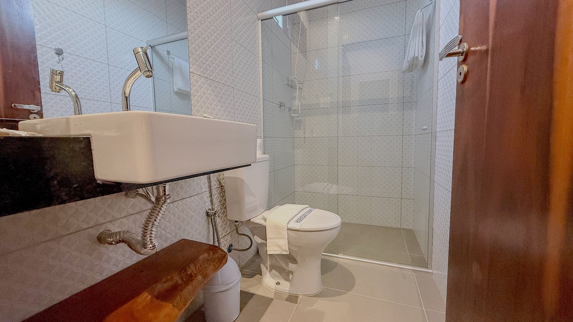 O banheiro, com seu design clean, acabamentos modernos e box de vidro, transmite uma sensação impecável de higiene e bem-estar, essencial para a experiência do hóspede.