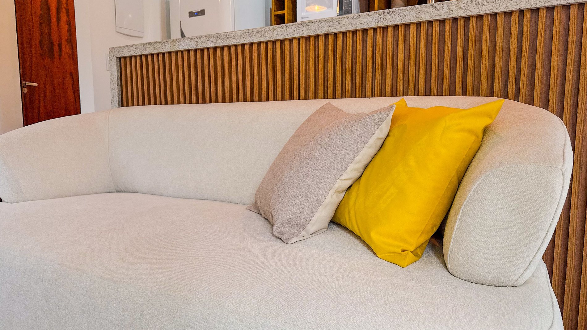 Cada metro quadrado foi inteligentemente otimizado. A cozinha, embora compacta, é exemplar em sua funcionalidade, com eletrodomésticos essenciais discretamente integrados. A marcenaria sob medida, como o armário no quarto, demonstra um planejamento cuidadoso para o conforto e organização do hóspede.